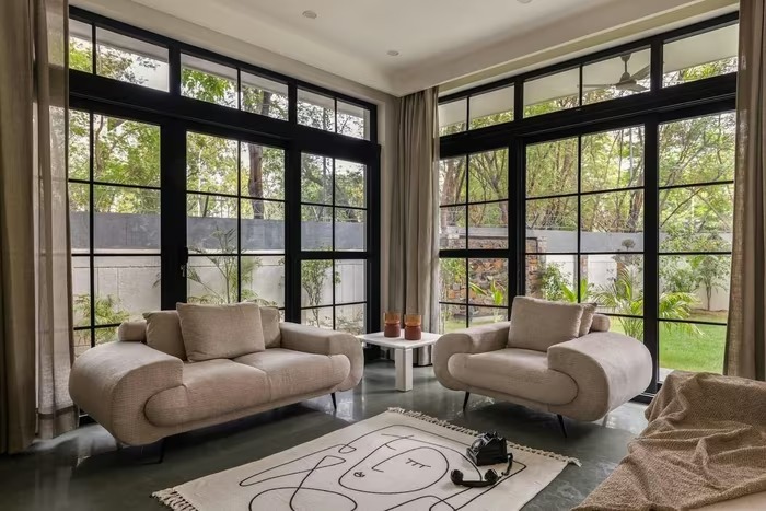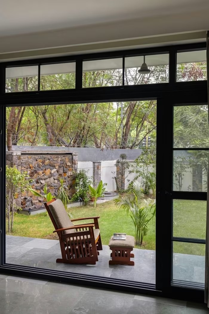 Ngôi nhà gồm 3 tầng, được tổ chức dựa trên trật tự không gian rõ ràng. Tại tầng trệt, lối vào chính mở ra một tiền sảnh có trần cao gấp đôi, tạo cảm giác rộng mở theo chiều dọc. Phòng khách mở ra khu vườn hướng Đông Bắc. Ảnh: Purnesh Dev Nikhanj |