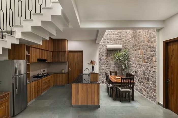 Bếp và khu vực ăn uống được bố trí dọc theo trung tâm, trở thành trái tim trong các hoạt động sinh hoạt của ngôi nhà. Ảnh: Purnesh Dev Nikhanj |