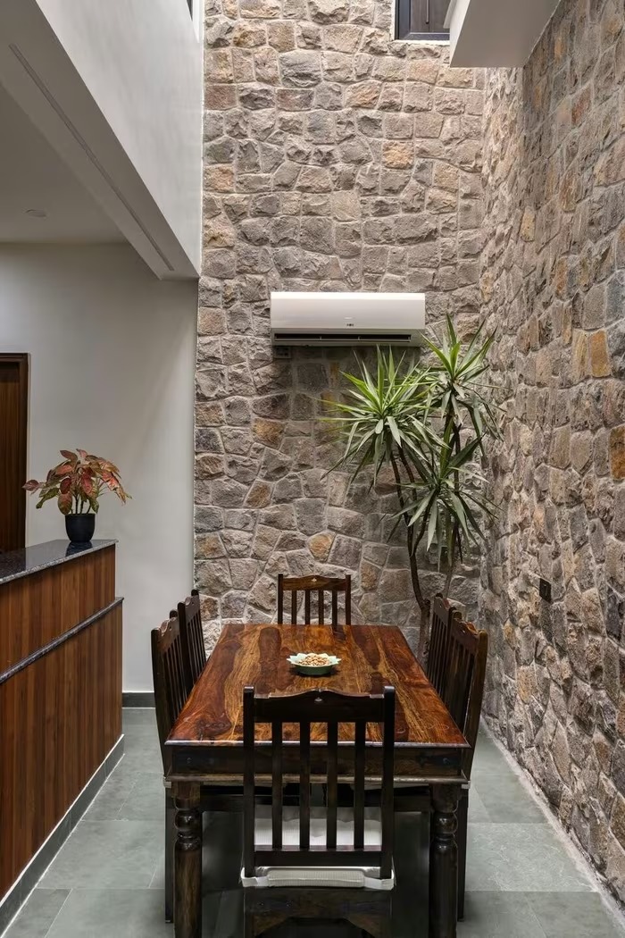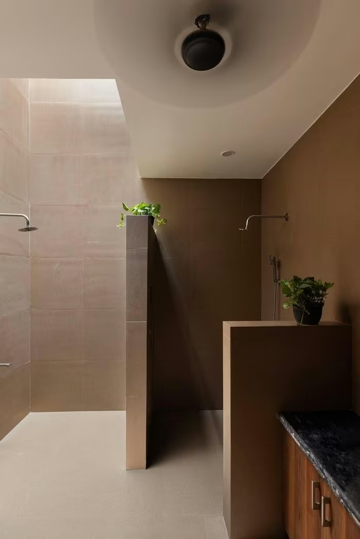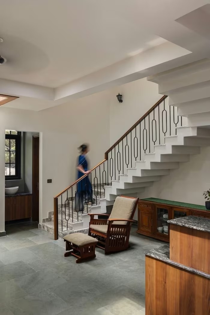 Các khoảng thông tầng được bố trí chiến lược tại sảnh vào, bên cạnh khu ăn uống, dọc cầu thang và trong phòng tắm tầng một. Ảnh: Purnesh Dev Nikhanj |