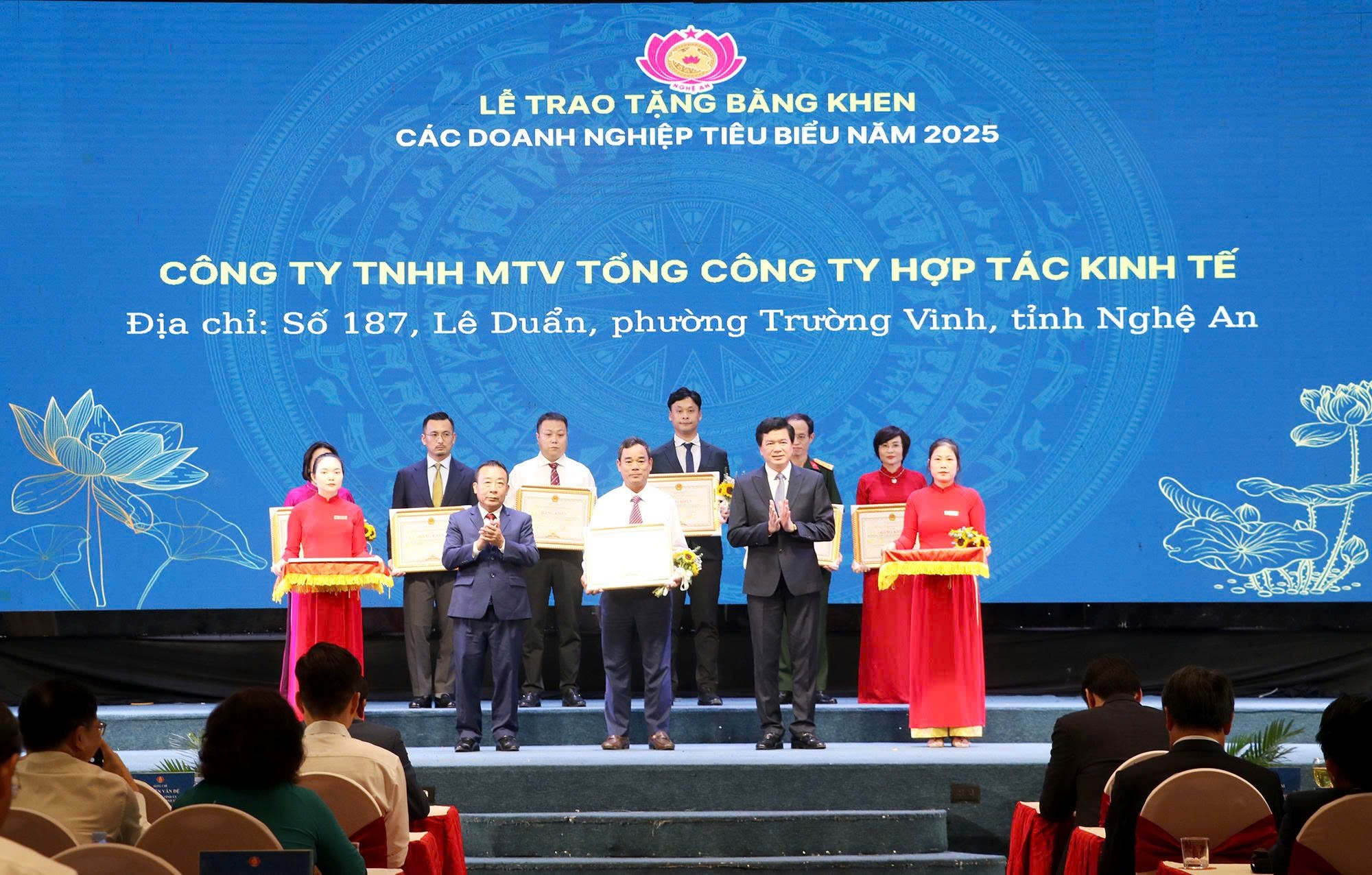 Phó Bí thư Thường trực Tỉnh ủy Hoàng Nghĩa Hiếu và Chủ tịch UBND tỉnh Lê Hồng Vinh trao Bằng khen của UBND tỉnh cho 10 doanh nhân tiêu biểu năm 2025 |