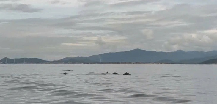 Vị trí xuất hiện đàn cá heo cách đảo Hòn Cau khoảng 1km. Đàn cá heo bơi nhảy, bám theo chiếc tàu khiến mọi người thích thú, ghi lại khoảnh khắc kỷ niệm.