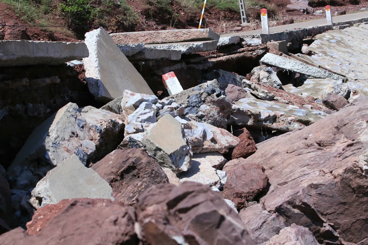 Khi bão đổ bộ, sóng lớn đánh trực tiếp vào nền đường khiến kết cấu bị xói lở, có chỗ khoét sâu cả mét. Nhiều phương tiện phải đi sát mép núi mới có thể lưu thông. Ảnh: ĐB |
