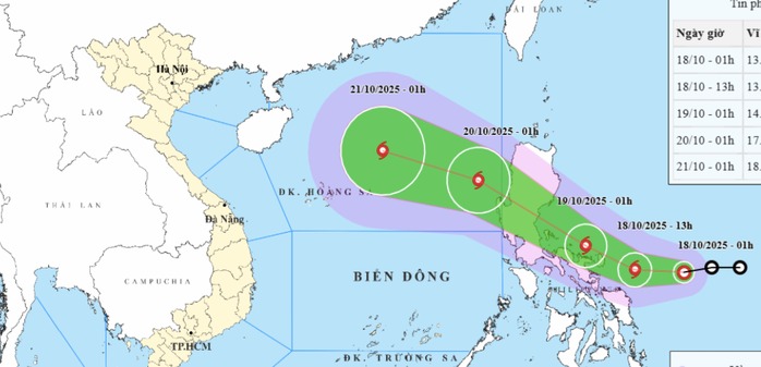Theo Trung tâm Dự báo khí tượng thủy văn quốc gia, hồi 1 giờ ngày 18-10, vị trí tâm áp thấp nhiệt đới ở khoảng 13,3 độ Vĩ Bắc; 127,8 độ Kinh Đông, trên vùng biển phía Đông miền Trung Philippines.