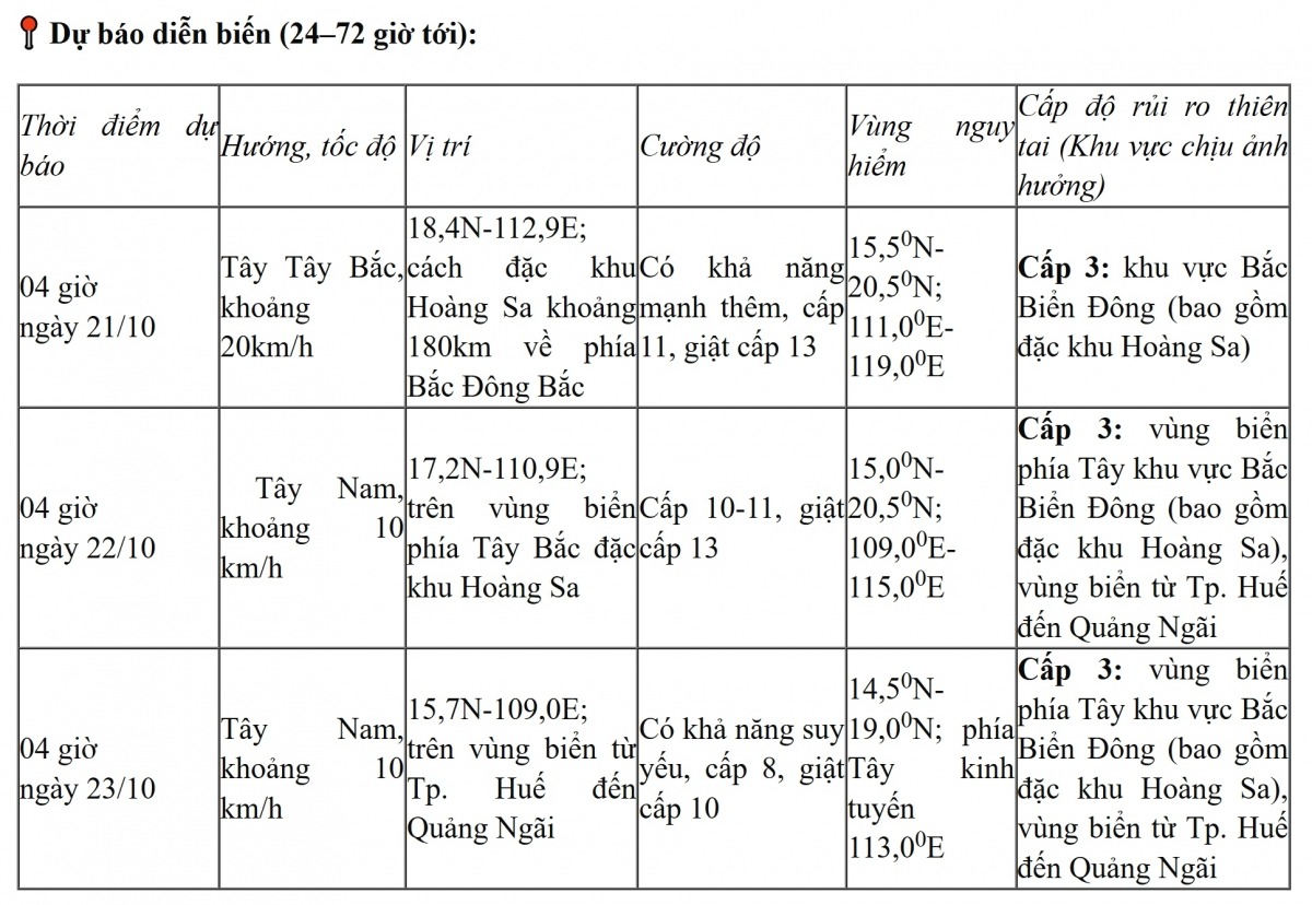 Hồi 04 giờ ngày 20/10, vị trí tâm bão ở vào khoảng 17,5 độ Vĩ Bắc; 117,2 độ Kinh Đông, cách đặc khu Hoàng Sa khoảng 540km về phía Đông Đông Bắc. Sức gió mạnh nhất vùng gần tâm bão mạnh cấp 9 (75-88km/giờ), giật cấp 11. Di chuyển theo hướng Tây Bắc với tốc độ khoảng 25km/h.