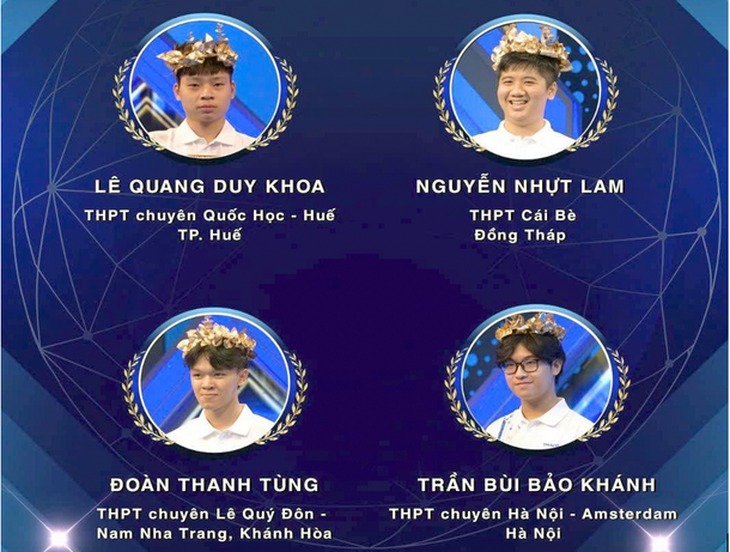 4 thí sinh vào chung kết Đường lên đỉnh Olympia 2025 là Lê Quang Duy Khoa (Trường THPT chuyên Quốc Học - TP Huế), Nguyễn Nhựt Lam (Trường THPT Cái Bè, Đồng Tháp), Đoàn Thanh Tùng (Trường THPT chuyên Lê Quý Đôn, Khánh Hòa) và Trần Bùi Bảo Khánh (Trường THPT chuyên Hà Nội - Amsterdam, Hà Nội).