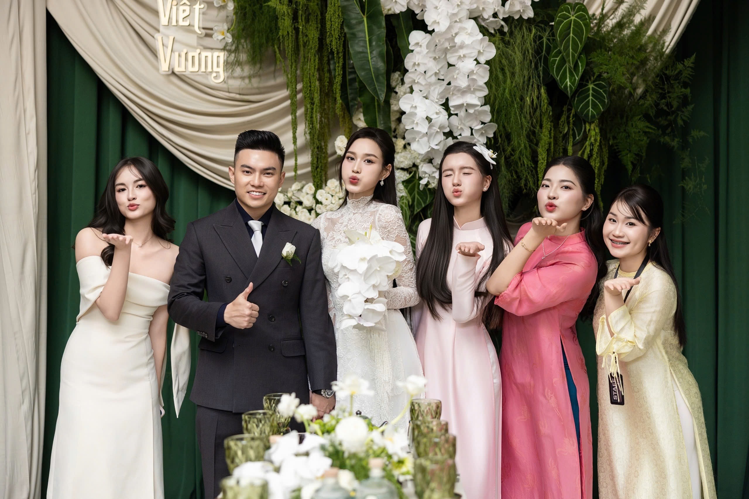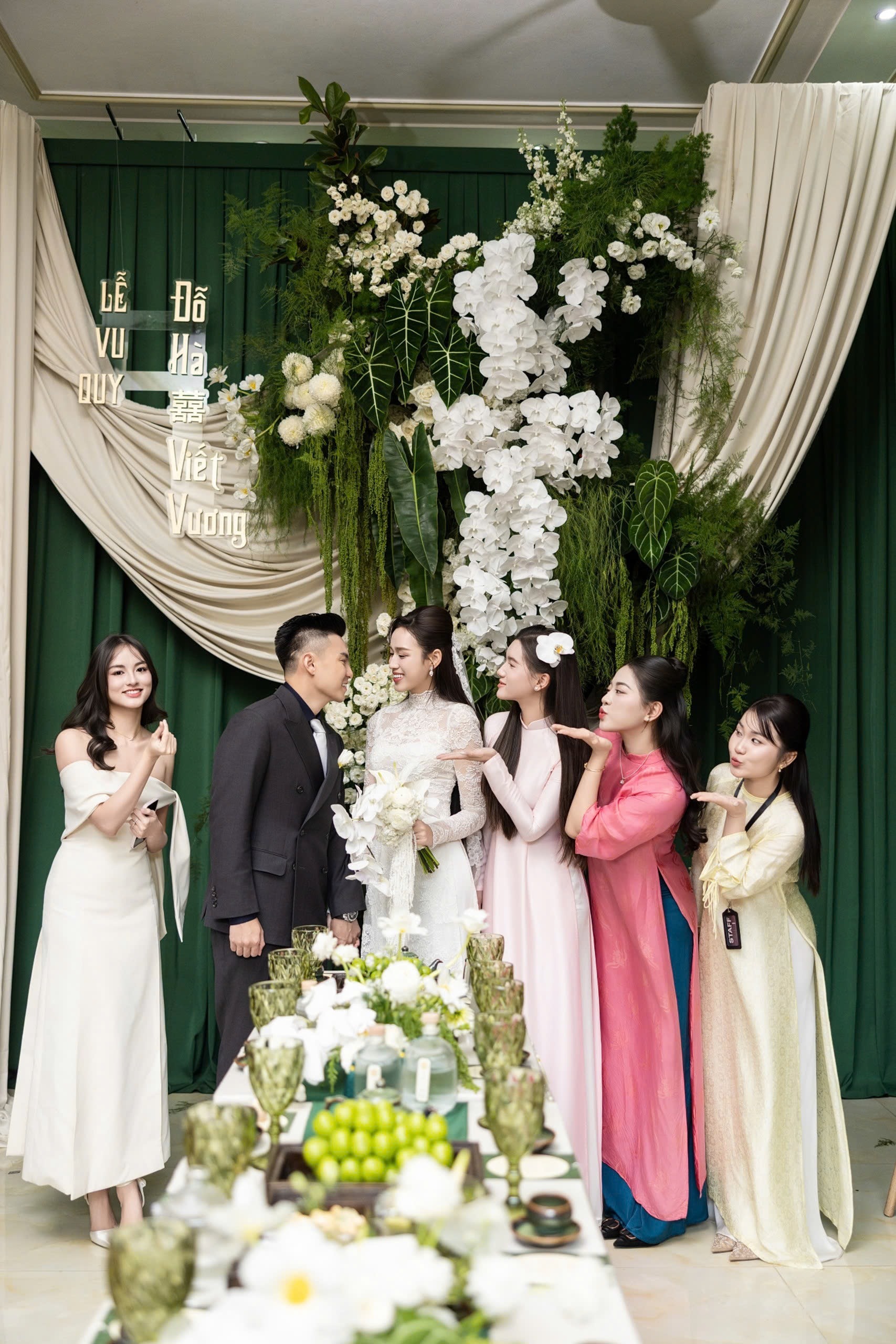 Trong buổi đón dâu, cô dâu Đỗ Thị Hà rạng ngời bên chú rể Nguyễn Viết Vương, cả hai nở nụ cười hạnh phúc trong sự chúc phúc của người thân và bạn bè.