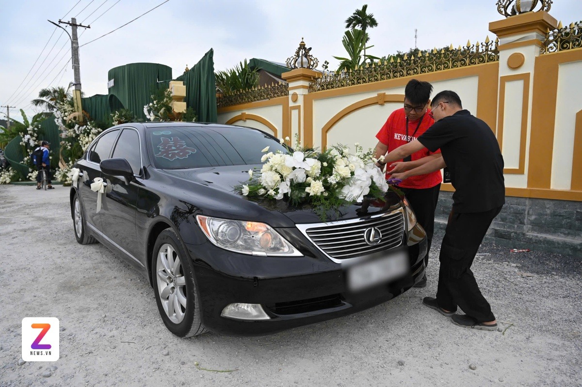 Chiếc Lexus LS460L màu đen đang được đội ngũ hoàn thiện khâu trang trí với nhiều hoa tươi, đính kết ở đầu và đuôi xe. Ôtô này nhận nhiệm vụ rước dâu. |