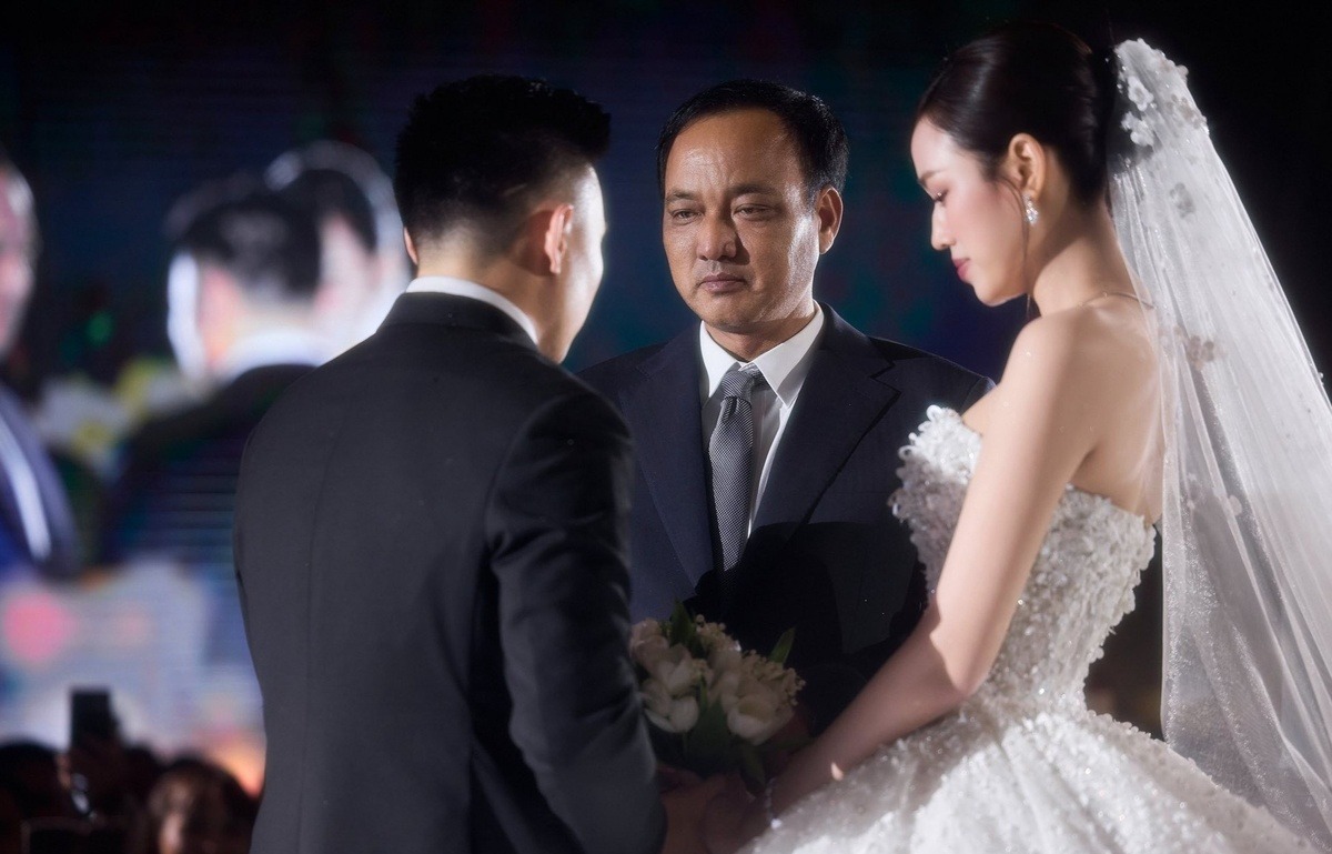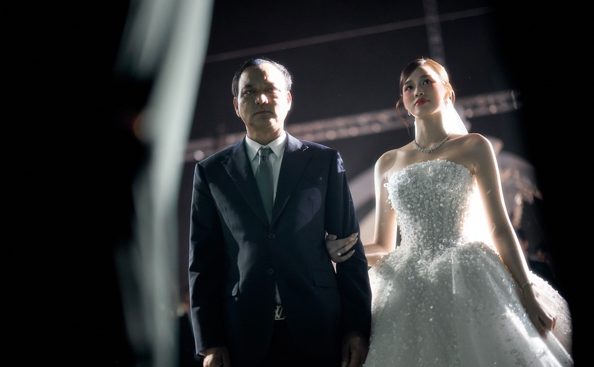 Với tiệc cưới diễn ra tối 22/10 bên bờ sông Nhật Lệ, Đỗ Thị Hà mặc 2 mẫu váy cưới. Một trong số đó phom dáng truyền thống với tùng xòe lớn cùng thân trên cúp ngực. Người đẹp được cha dắt lên sân khấu, trao tay cho chú rể với lời chúc phúc trăm năm hạnh phúc từ đấng sinh thành. Khoảnh khắc này khiến Đỗ Thị Hà một lần nữa xúc động rơi nước mắt. |