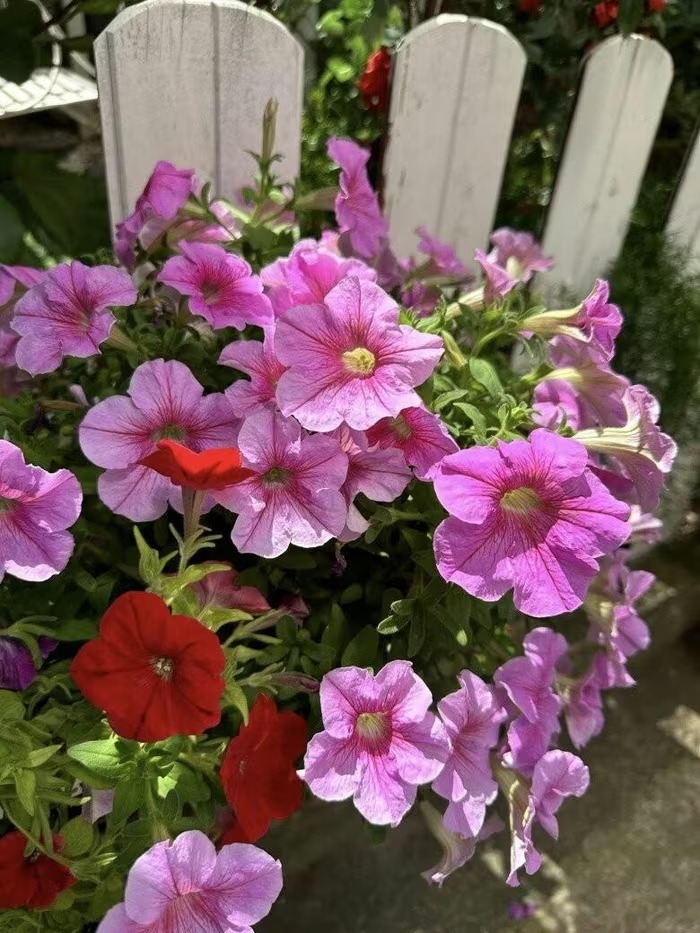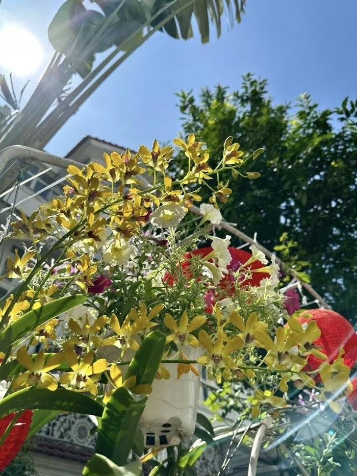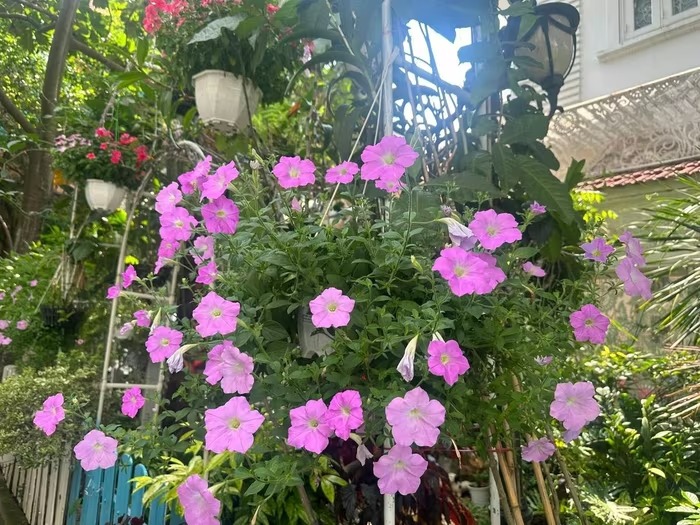Hàng rào được tô điểm bằng giỏ hoa treo rực rỡ. Ảnh: FB Nguyễn Vy Oanh |