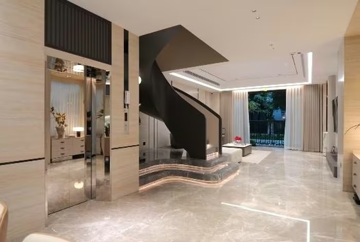 Bậc thang được ốp đá marble xám vân trắng, tay vịn uốn cong mềm mại. Ảnh: FBNV |