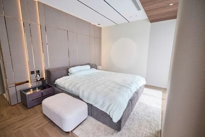 Phòng ngủ master thiết kế ấm cúng với tường ốp, giường bọc đệm dày và ánh sáng dịu nhẹ. Ảnh: FBNV |