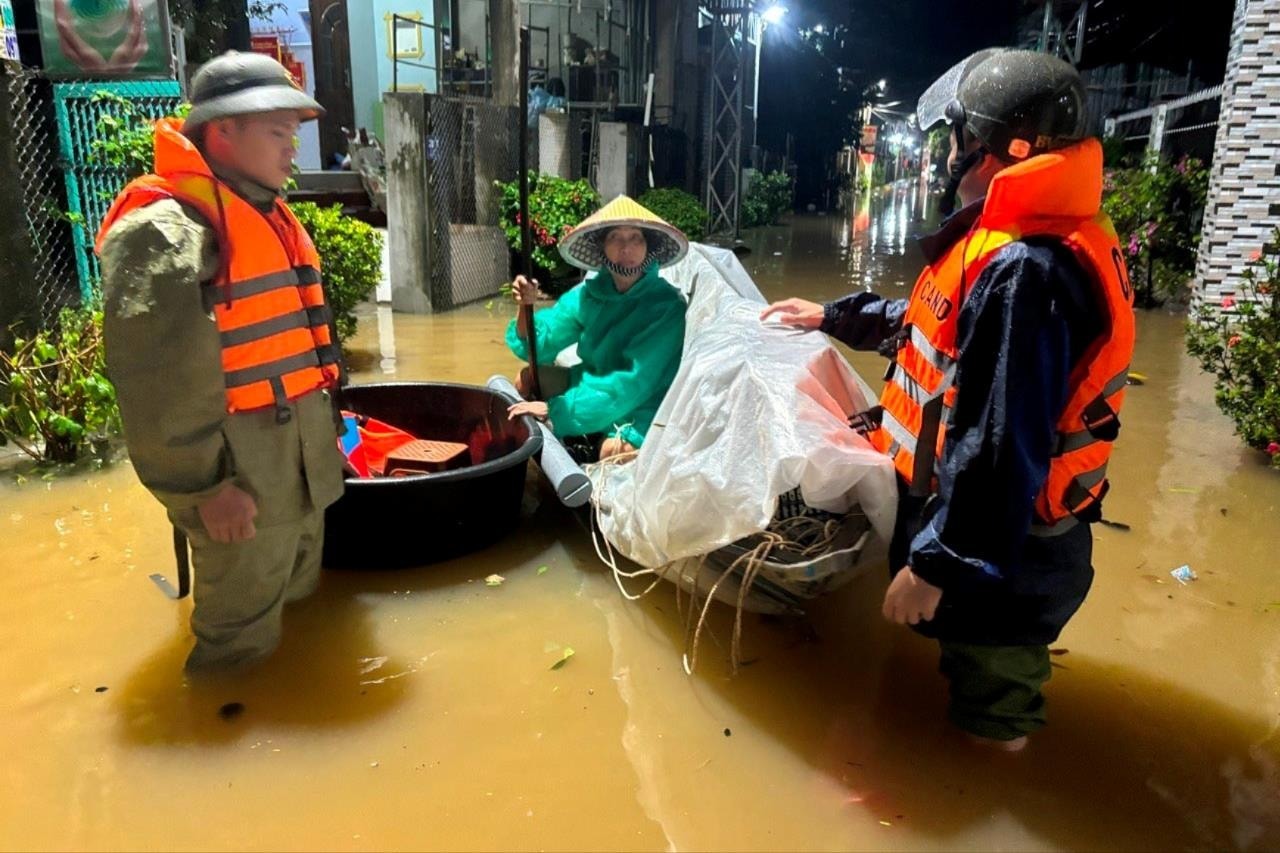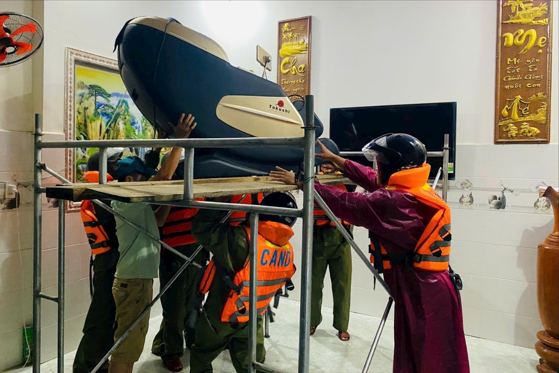 Lực lượng Công an xã hỗ trợ người dân di chuyển bằng ghe đến nơi an toàn trong đêm 26/10. |