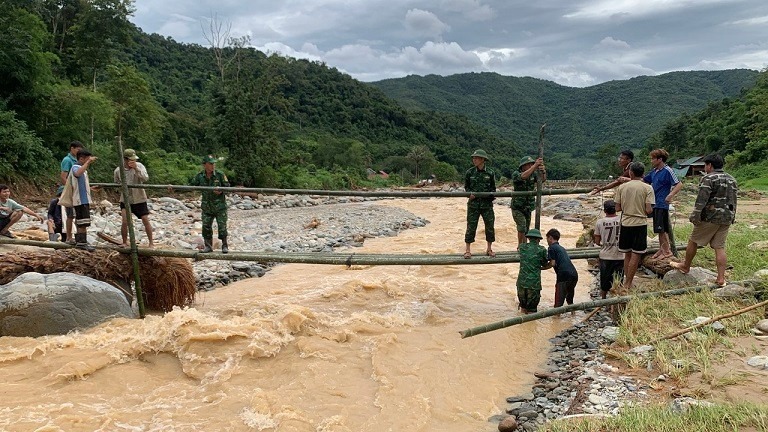 Bộ đội Biên phòng tổ chức làm cầu tạm vào bản bị nước lũ cô lập. |