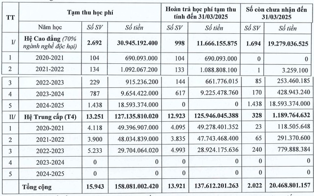 Nhà trường cho biết đã thực hiện hoàn trả đầy đủ cho phần lớn học sinh, sinh viên liên quan và tính đến ngày 31/3/2025, số tiền chưa hoàn trả thuộc khối Trung cấp T4 còn hơn 1,18 tỷ đồng của 328 người học, nguyên nhân chủ yếu do sinh viên chưa cung cấp hoặc cung cấp sai tài khoản ngân hàng.