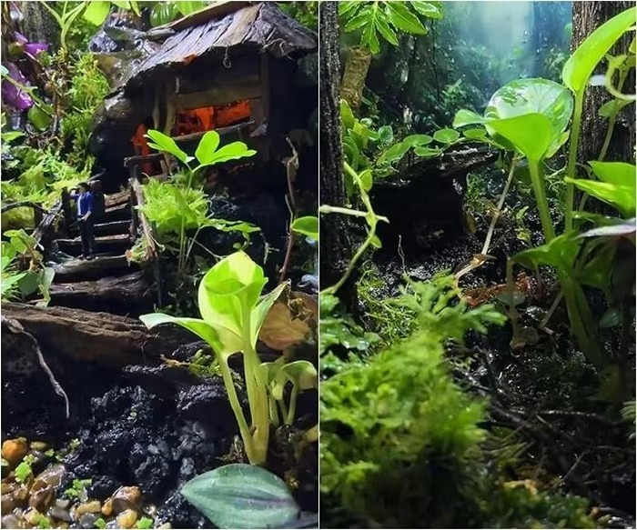 Elly Trần tỉ mỉ gắn mô hình người leo núi, đèn sáng, suối nước trong nhà tí hon. Ảnh chụp màn hình |