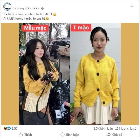 Bài đăng được chia sẻ với tiêu đề hài hước: "T không tìm content, content tự tìm đến t. Ai không biết t mặc áo của bà". Kèm theo đó là hai bức ảnh so sánh: một bên là ảnh hình mẫu mặc, và một là ảnh cô gái tự mặc.