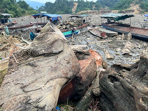 Ghi nhận của PV, trên phía đập phụ của hồ thủy điện Hủa Na, lượng rác tập trung dày đặc và trải rộng, dài hàng trăm mét, xuất hiện mùi từ những cây gỗ ngâm dưới nước lâu ngày. Dưới hồ, hàng trăm loại rác lớn nhỏ nhấp nhô theo từng đợt sóng chất dày lớp lớp. Trên đập phụ, hàng chục chiếc thuyền lớn nhỏ neo đậu vì không thể di chuyển giữa đống rác. Giữa hồ, một số người vớt củi đang cố gắng kéo từng cây gỗ lớn nhỏ lên thuyền, hoặc xô về phía bờ để mang về.