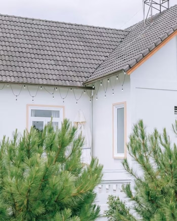 | Căn biệt thự sơn trắng, mái ngói xám trầm, bao quanh là thông xanh. Ảnh: Facebook |