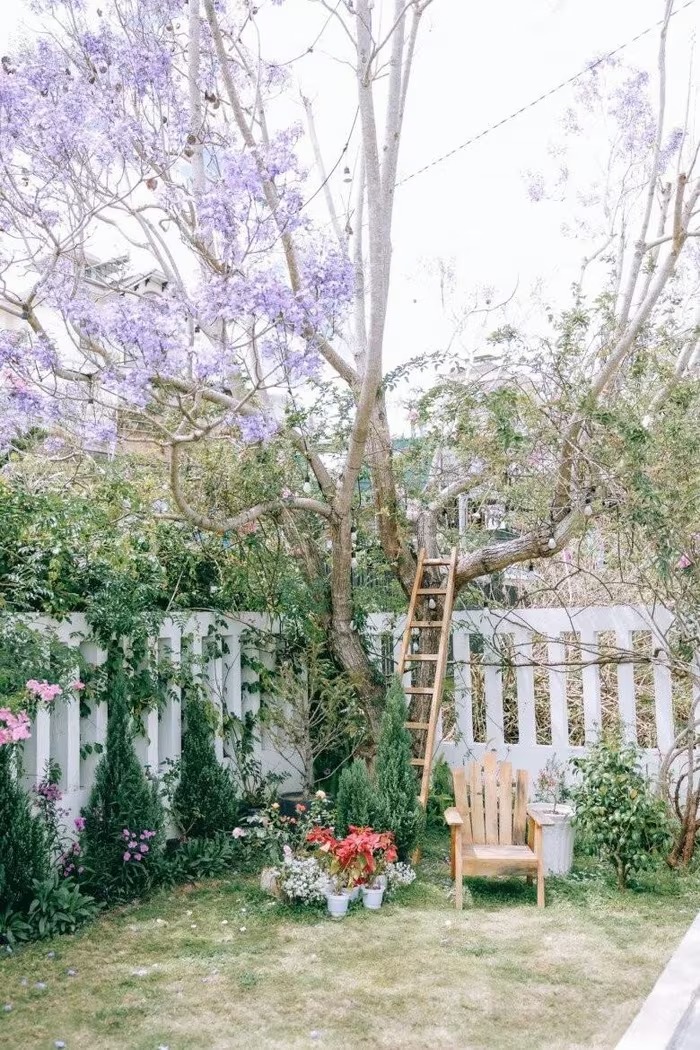 | Dưới gốc cây có chiếc ghế gỗ, xung quanh là chậu hoa nhỏ tạo góc thư giãn đầy chất thơ. Ảnh: Facebook |