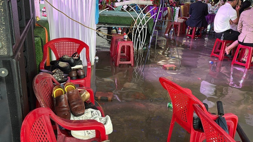 Dù được bố trí ở khu vực khá cao, thoáng đãng, khu vực rạp cưới vẫn bị ngập qua mắt cá chân người lớn. Thay vì đi giày, những người tham dự phải chuyển sang dép, ủng hoặc chân trần để thích nghi. Bên trong, hệ thống loa đài, âm thanh ánh sáng cũng được kê cao để tránh nước làm hư hại.