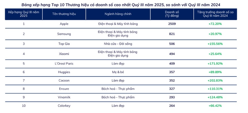Trong bảng xếp hạng 10 thương hiệu có doanh số cao nhất quý, Apple dẫn đầu, theo sau là Samsung với 821 tỷ đồng (tăng 21%) và Top Gia - thương hiệu thuộc nhóm hàng Nhà cửa và Đời sống - đạt 506 tỷ đồng (+156%). Ở nhóm thương hiệu công nghệ, Xiaomi cũng ghi nhận mức tăng trưởng ấn tượng 25%.