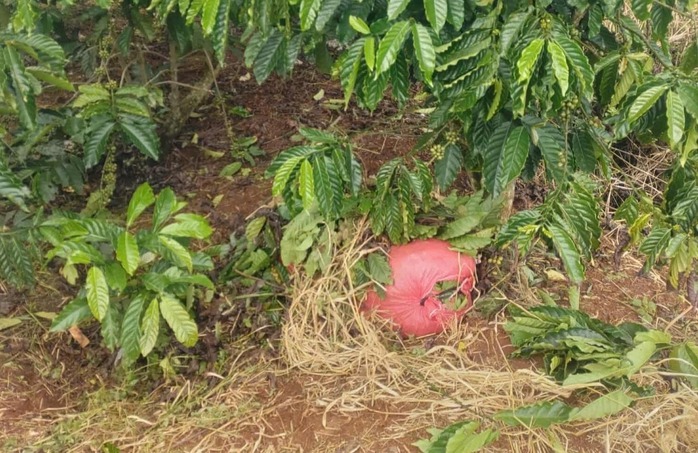 Một trong 2 bao cà phê mà M. giấu trong vườn nhà ông Tr. sau khi hái trộm. |