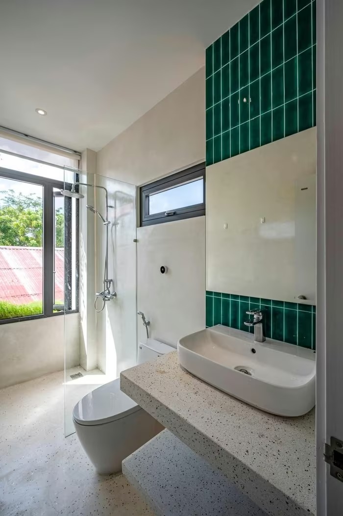 Phòng tắm sử dụng gam màu trắng chủ đạo. Ảnh: Lilo Studio |