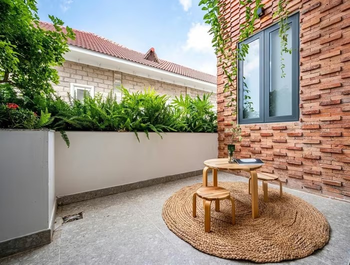 Đáp ứng mong muốn giữ gìn các nét truyền thống của Việt Nam xưa, kiến trúc sư áp dụng giải pháp ốp gạch đỏ giả cổ ở phần kiến trúc bên ngoài. Ảnh: Lilo Studio |