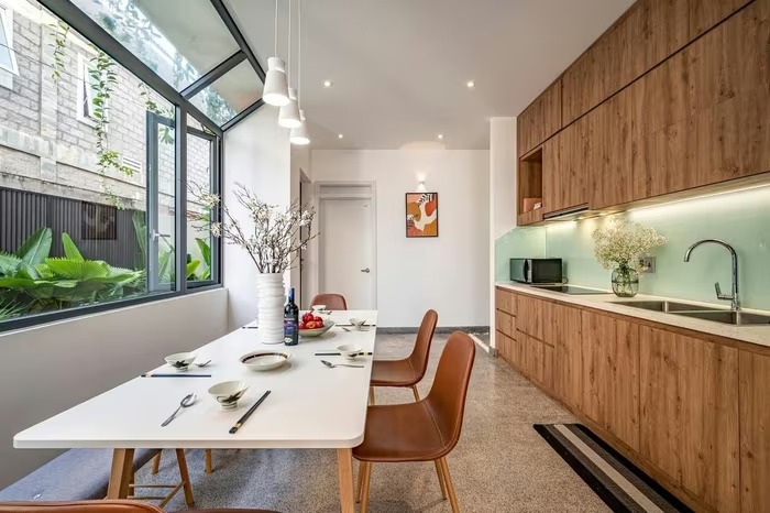 Bếp và bàn ăn bố trí cạnh cửa sổ lớn lấy ánh sáng. Ảnh: Lilo Studio |