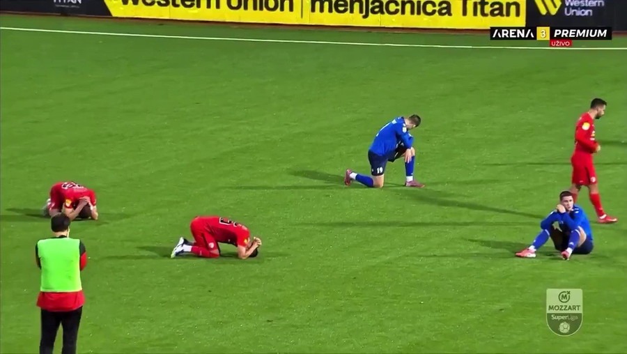 Nạn nhân xấu số là HLV Mladen Zizovic của Radnički 1923, ông bất ngờ đổ gục trên đường biên ở phút 22.
