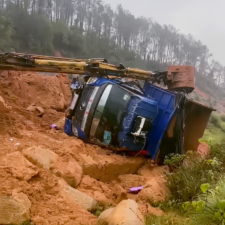 Sạt lở núi xô nghiêng máy múc và xe tải, hai công nhân bị thương