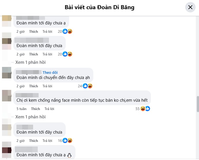Theo đó, bài đăng gần nhất của Đoàn Di Băng từ ngày 27/8 cũng là thông báo liên quan đến sản phẩm của Hanayuki. Phía dưới bài viết, nhiều người để lại bình luận giống nhau: “Đoàn mình di chuyển tới đây chưa”. Ngoài ra, rất nhiều bình luận khác hỏi thăm về tình hình hiện tại của Đoàn Di Băng, thông báo về việc doanh nhân Nguyễn Quốc Vũ bị điều tra,... Tất cả như tạo nên một “bãi chiến trường” hỗn loạn dưới bài đăng này của Đoàn Di Băng.