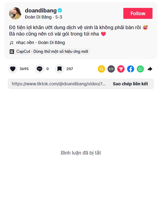 Song, điều này chỉ xảy ra trên Facebook của Đoàn Di Băng bởi ở nền tảng TikTok từ lâu nay, cô đã khoá tính năng bình luận nên không bị “tấn công” trang cá nhân.