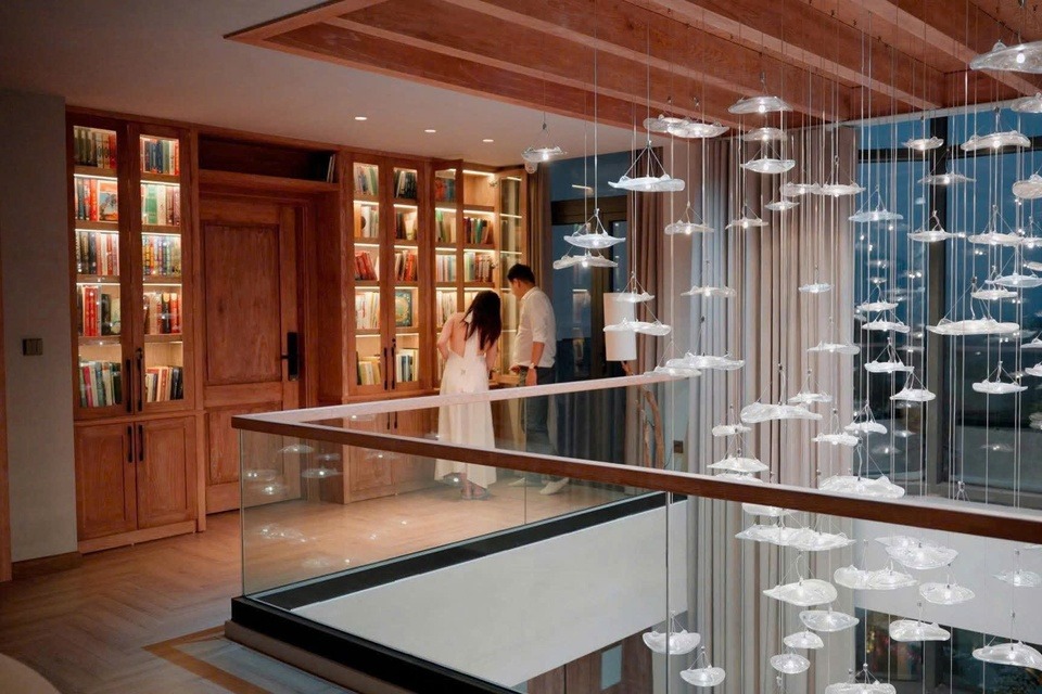 Vật liệu chủ đạo là gỗ sồi, đá tự nhiên và kính. Các mảng cửa kính lớn được bố trí để lấy sáng, mở tầm nhìn ra vườn. Theo chị, đó là bức tranh thiên nhiên sống động nhất mà không cần thêm bất kỳ chi tiết trang trí nào. Cầu thang xoắn ốc 3 tầng cùng dàn đèn chùm được lấy cảm hứng từ những giọt mưa ánh sáng nước, là điểm nhấn trong kiến trúc tổng thể.