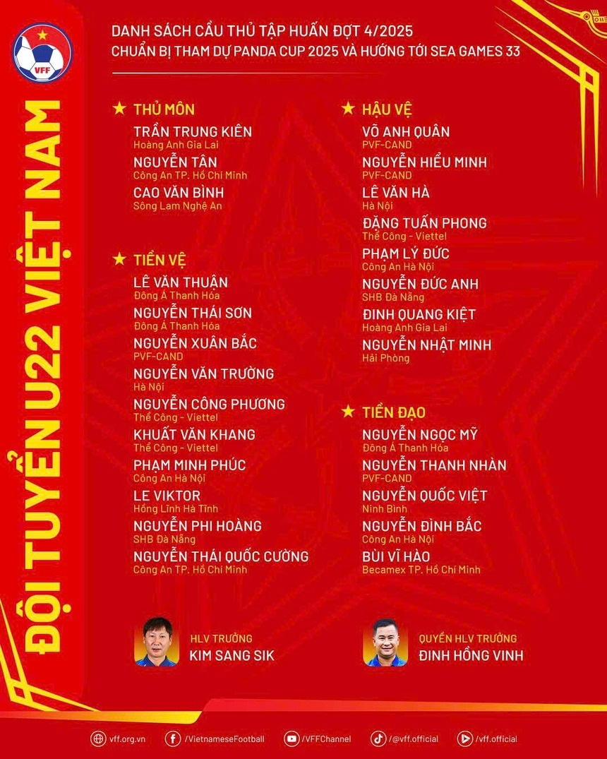 Dẫn dắt U22 Việt Nam thi đấu tại Panda Cup 2025 là quyền HLV trưởng Đinh Hồng Vinh. Sau giải, đội tiếp tục rèn quân tại Bà Rịa - TP.HCM từ 23 đến 29/11, trước khi di chuyển sang Thái Lan bước vào chiến dịch SEA Games 33.