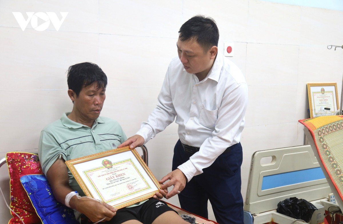 Ông Nguyễn Văn Huy, Chủ tịch UBND đặc khu Lý Sơn, tỉnh Quảng Ngãi trao giấy khen tặng ông Phan Duy Quang vì có hành động dũng cảm cứu người trong cơn bão số 13. |