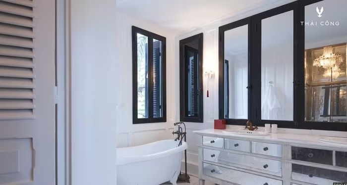Phòng tắm theo phong cách Venice, đá cẩm thạch trắng và ốp gỗ. Ảnh: FBNV |