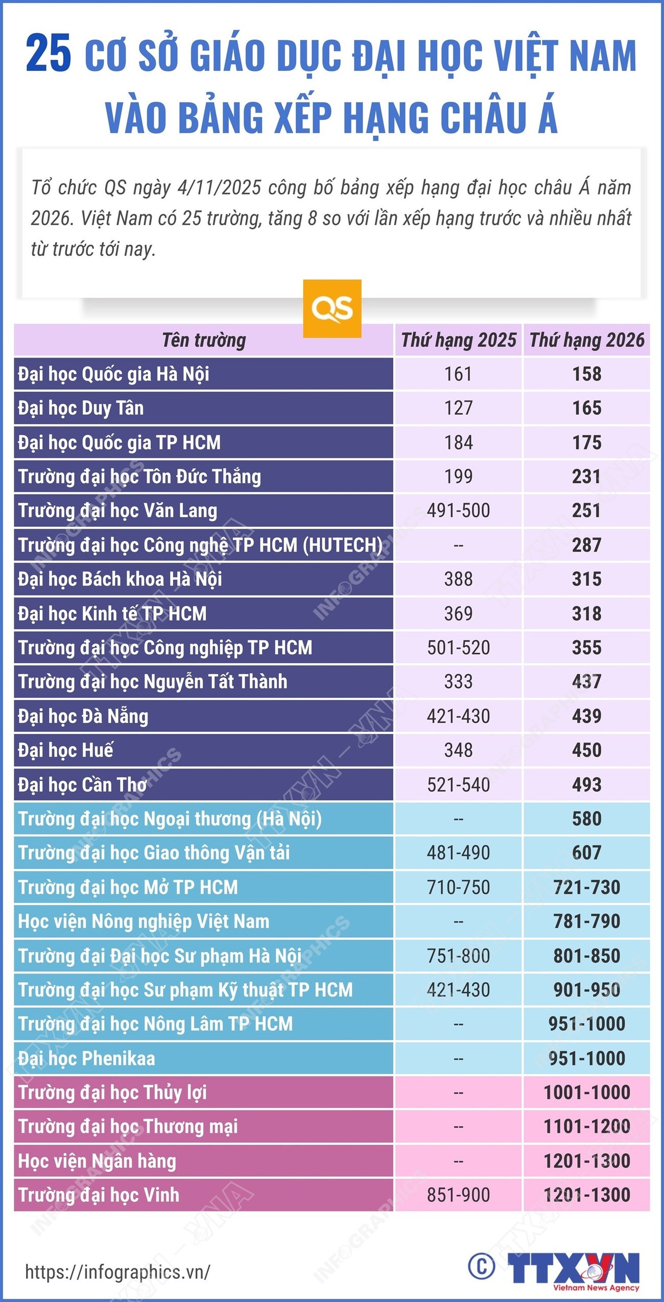 Theo kết quả xếp hạng các trường đại học châu Á 2026 (QS AUR 2026) do Tổ chức xếp hạng Quacquarelli Symonds vừa công bố, Việt Nam có 25 cơ sở giáo dục đại học trong bảng xếp hạng này, trong đó có 8 trường lần đầu tiên tham gia.
