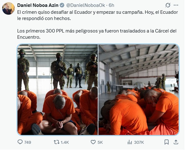 Tổng thống Daniel Noboa ngày 10/11 (giờ địa phương) nhấn mạnh đây là một phần trong chiến lược của ông để giảm thiểu sự kiểm soát của các băng đảng tội phạm đang hoạt động mạnh mẽ trong các nhà tù quá tải của quốc gia này. “300 tù nhân nguy hiểm nhất đầu tiên đã được chuyển đến nhà tù Encuentro”, ông Noboa chia sẻ trên X, kèm theo những hình ảnh các tù nhân ngồi trên sàn, mặc đồng phục màu cam, đầu cạo trọc, và xung quanh là lính canh.