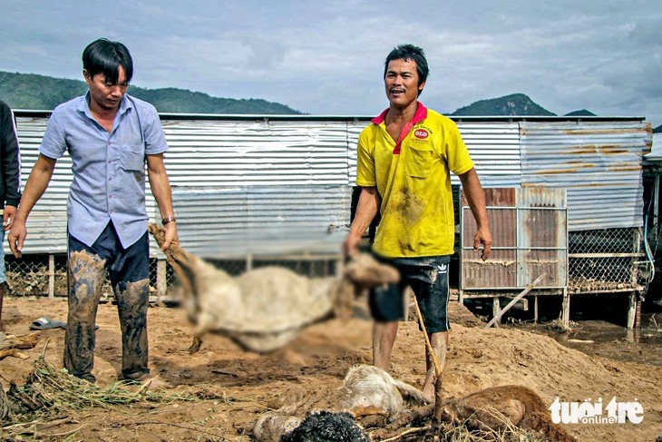 Gia súc bị lũ cuốn được tìm thấy vào sáng hôm sau khi nước rút - Ảnh: ĐỨC CƯỜNG |