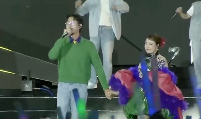 Đen Vâu nắm tay Hoàng Thùy Linh trên sân khấu ở Quảng Ninh. |