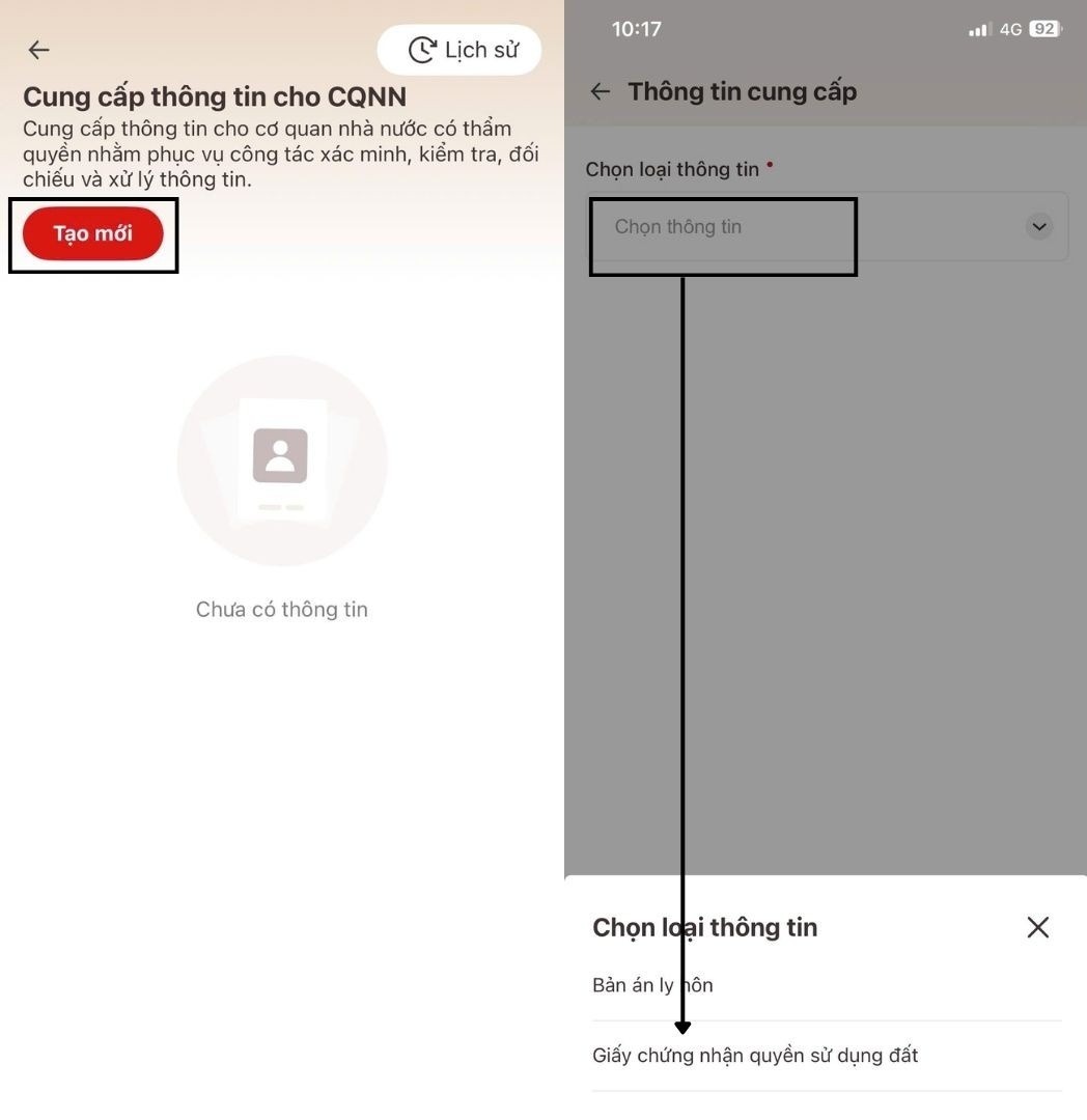 Bước 3: Ấn Tạo mới yêu cầu. Tại phần Chọn loại thông tin, chọn Giấy chứng nhận quyền sử dụng đất. Ứng dụng sẽ tự động trích xuất thông tin cá nhân của người kê khai bao gồm họ và tên, số định danh cá nhân.