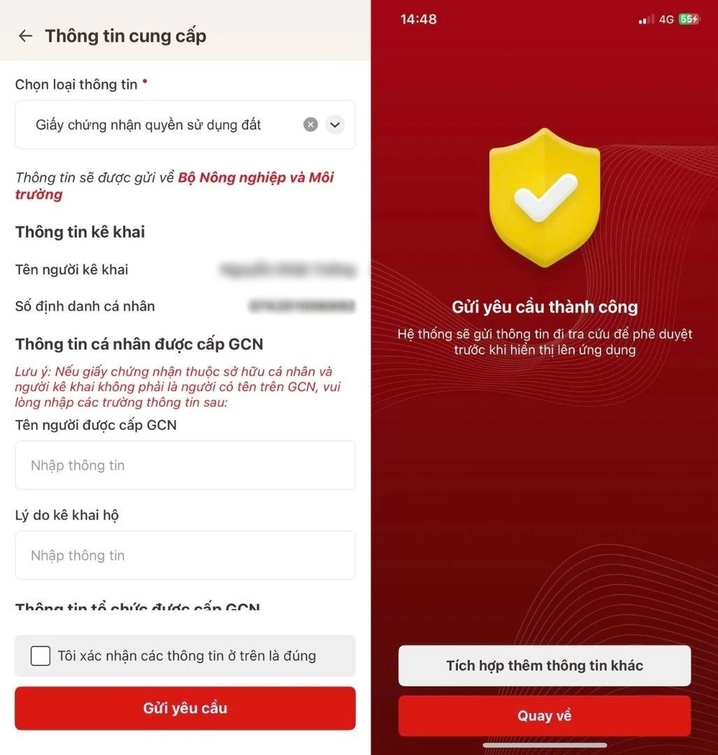 Cuối cùng, người kê khai thông tin ấn vào ô xác nhận thông tin trên là đúng và gửi yêu cầu. Bộ Nông nghiệp và Môi trường sẽ tiếp nhận và xử lý yêu cầu.
