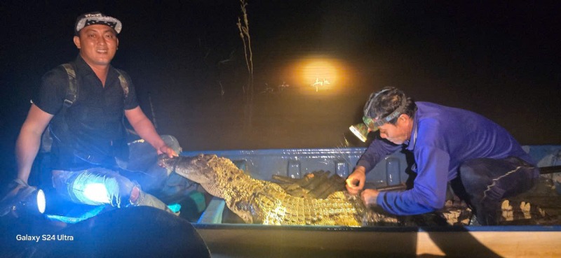 Trước đó, khuya 12/11, anh Chuyển cùng một người bạn đánh bắt cá trên sông Cái Cỏ, đoạn giáp với biên giới Campuchia thì phát hiện một con vật lớn giật tung lưới. Khi anh và người bạn kéo lưới lên thì phát hiện con cá sấu đang cố vùng vẫy thoát khỏi lưới.