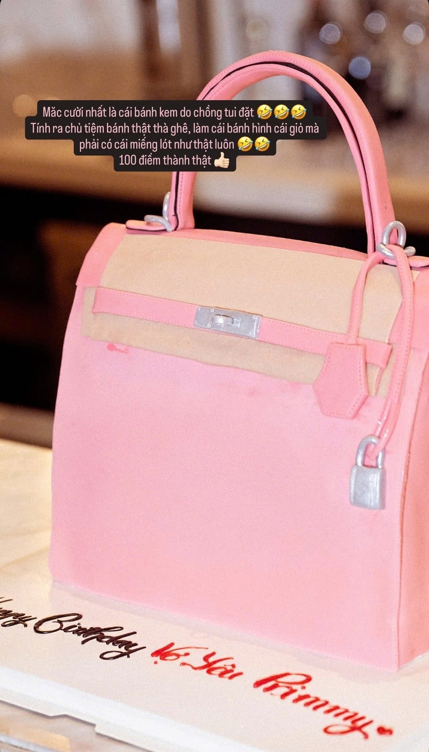 Nữ beauty blogger bày tỏ hạnh phúc khi được chồng quan tâm, nói vui rằng nếu anh không tổ chức bữa tiệc, hẳn cô sẽ "ở nhà nằm coi phim, lười ra đường". Điều khiến cô bất ngờ hơn cả là chiếc bánh kem được thiết kế mô phỏng chiếc túi Hermès màu hồng. |
