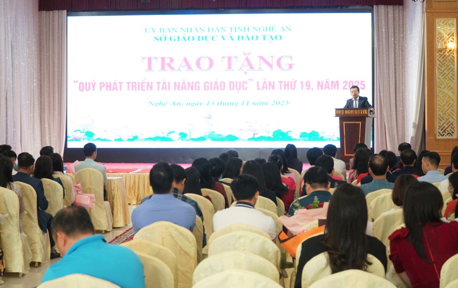 Chiều 13/11, Sở GD&ĐT Nghệ An tổ chức trao tặng “Quỹ phát triển tài năng giáo dục” lần thứ 19 năm 2025. Đây là hoạt động ý nhằm tôn vinh, biểu dương những cá nhân tiêu biểu của ngành Giáo dục và Đào tạo Nghệ An. Đồng thời là dịp để tri ân, tôn vinh những người thầy, người cô đã dành trọn tâm huyết cho sự nghiệp trồng người, hướng tới kỷ niệm 43 năm Ngày Nhà giáo Việt Nam.