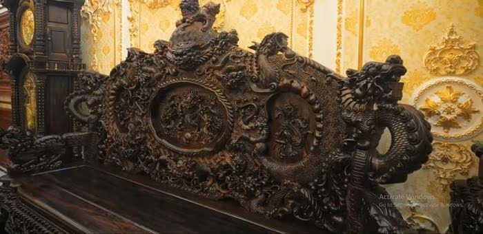 Một phòng khác nổi bật với bộ bàn ghế gỗ mun chạm rồng tạo cảm giác uy nghi, sang trọng. Ảnh chụp màn hình NhaTo |