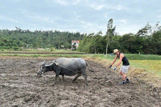 Du khách Pháp thử cày ruộng ở đảo Cô Tô. Ảnh: Thu Báu. |
