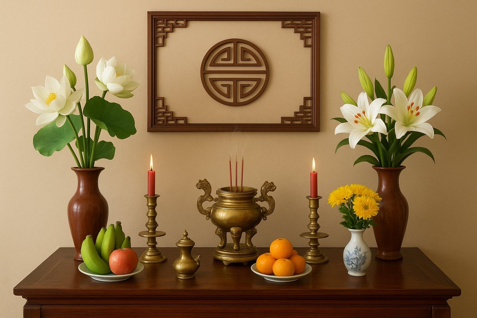Ngoài câu chuyện hoa chậu, điều quan trọng nhất khi bày biện bàn thờ vẫn là tấm lòng của gia chủ. Việc đặt chậu hoa hay hoa cắt cành chỉ là hình thức; điều làm nên giá trị tâm linh chính là sự thành kính và chăm sóc bàn thờ thường xuyên: lau dọn sạch sẽ, thay nước hằng ngày, giữ hương hoa luôn tươi mới. Một lọ hoa cắt cành chăm chút còn đẹp và ý nghĩa hơn nhiều so với một chậu hoa đặt lên chỉ vì tiện.