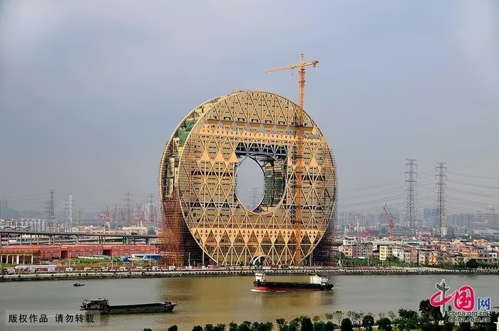 Đây là tòa nhà hình tròn cao nhất thế giới. Đặc biệt, ở vị trí trung tâm của tòa nhà còn có một lỗ trống, biến nó trở thành một đồng tiền xu khổng lồ. Ảnh: China |